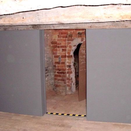 Zusätzlich wurde eine Klimaschutzwand auf der Rückseite der Westwand errichtet. Sie trennt jetzt die Malereien von dem nicht klimatisierten Turm mit seinen wechselnden Temperaturen und vor allem der stark schwankenden Luftfeuchtigkeit.