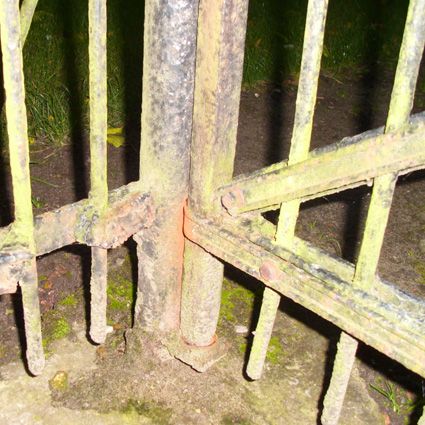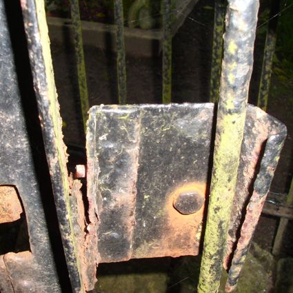 Die waagerechten Bänder des Staketenzauns waren zerfressen, das Schloss der Eingangspforte war auseinandergebrochen.
