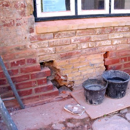 Risse wurden geöffnet und sach- und fachgerecht verschlossen. Mauerziegel wurden in Teilbereichen, vor allem im Sockelbereich, ersetzt. Mauerwerksfugen wurden ausgeräumt und mit Muschelkalk wieder verfugt.