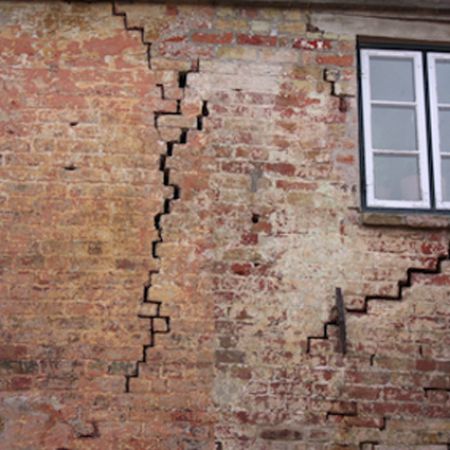 In der Fassade sind massive Risse zu erkennen. Fehlende oder zerstörte Ziegel wurden ersetzt.