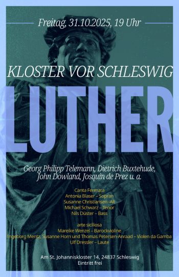 Musik am Reformationstag, 19:00 Uhr im Remter Mit diesem Konzert am Reformationstag möchten wir den zunehmenden Halloweenfeiern etwas entgegensetzen und daran erinnern, dass Martin Luther im Jahre 1517 seine 95 Thesen an die Tür der Schlosskirche zu Wittenberg geschlagen hat. Im ersten Programmteil werden wir Vertonungen von Martin Luthers Texten vorstellen. „Ein feste Burg ist unser Gott“ ist wohl einer der bekanntesten Liedtexte. Wir möchten die Kantate von Georg Philipp Telemann (1681-1767) dem Choral von Joseph Klug (1486-1556) gegenüberstellen. Ergänzend wird "Mit Fried und Freud" von Dietrich Buxtehude (1637-1707) sowie „Nun bitten wir den heilgen Geist“ von Michael Praetorius (1571-1621) erklingen. Nach einer kurzen Pause, in der Sie bei einem Glas Wein oder Wasser mit den Musikern ins Gespräch kommen, und gern auch etwas über die Instrumente erfahren können, werden im zweiten Teil weltliche Kompositionen erklingen. Josquin de Prez (1450-1521) ist ein Zeitgenosse Luthers (1483 -1546) gewesen, von ihm sollen ebenso Stücke erklingen wie von William Byrd (~1540-1623) oder John Dowland (1563-1626). Ausführende sind der solistisch besetzte Kammerchor Canta Fermata mit Antonia Blaser, Susanne Christiansen, Michael Schwarz und Nils Düster. Es spielt das Instrumentalensemble arte siciliosa mit Mareike Wenzel (Barockvioline), Ingeborg Mentz, Susanne Horn und Thomas Petersen-Anraad (Violen da Gamba) und Ulf Dressler (Laute). Der Eintritt ist frei – die Künstler freuen sich aber über eine angemessene Spende.